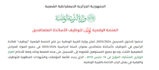فتح موقع المنصة الرقمية لتوظيف المتعاقدين في قطاع التربية قريبا أي بداية من شهر سبتمبر، عبر الموقع الإلكتروني التالي الآن فتح موقع تسجيلات توظيف الأساتذة عبر الإنترنت tawdif.education.dz